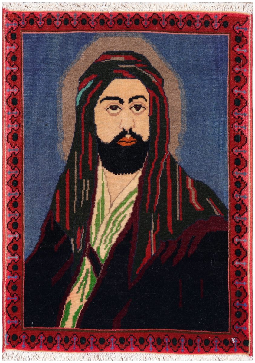 a Tabriz pictorial rug that shows Imam Ali ibn Abi Talib holds a unique and revered position in Islamic history as both the cousin and son-in-law of Prophet Muhammad. Born in 600 CE inside the sacred Kaaba in Mecca-a miraculous event unmatched in history-Ali was the first male to embrace Islam and became a steadfast supporter of the Prophet throughout his life.