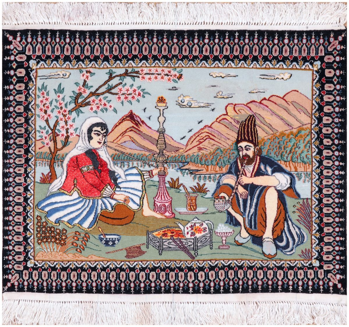 this Tabriz Pictorial carpet presents an iranian carpet in about 150 years ago , they are drinking and smoking in a picnic.