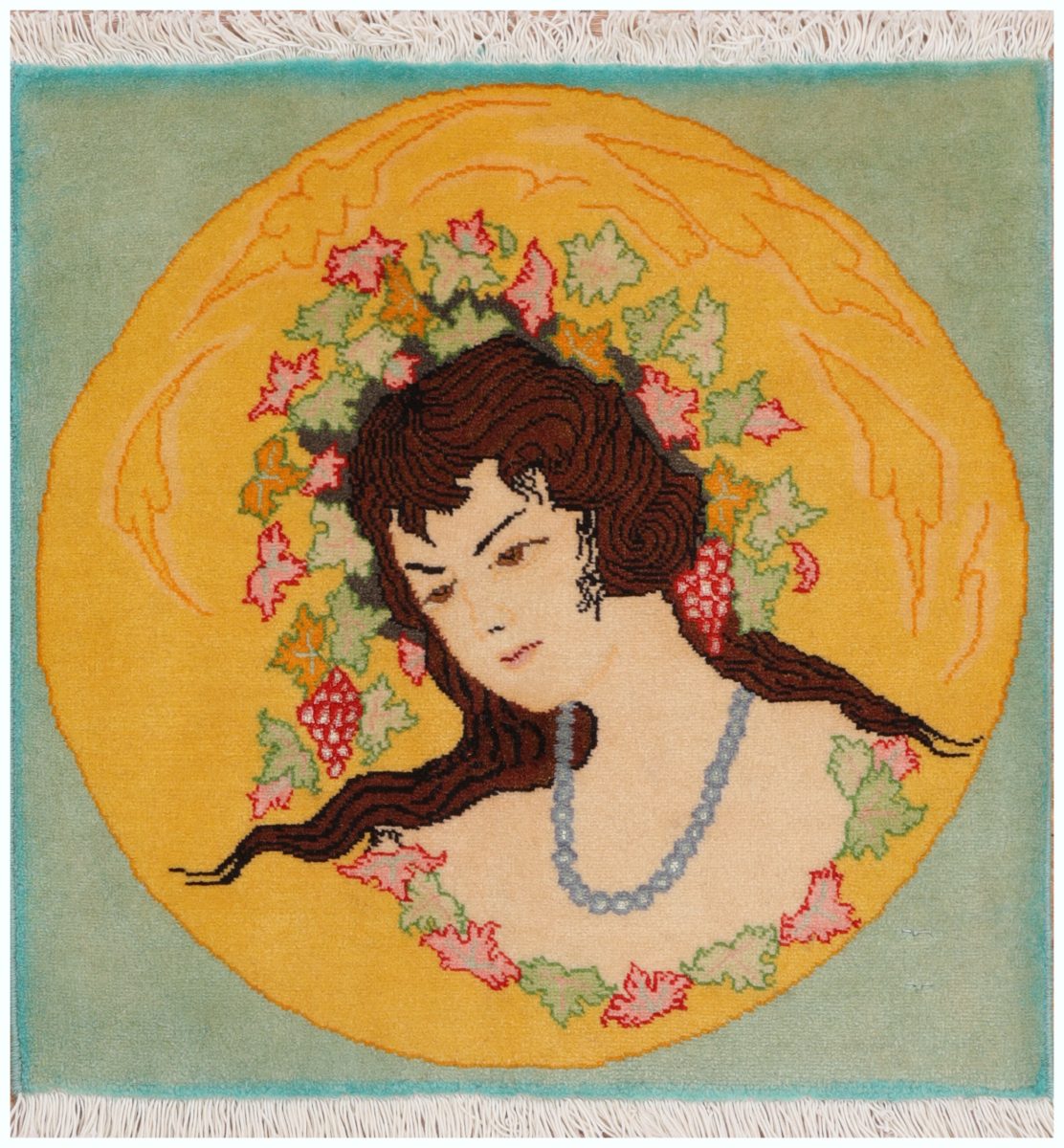 this Tabriz Pictorial rug presents a young lady sorrounded by grapes and braches.