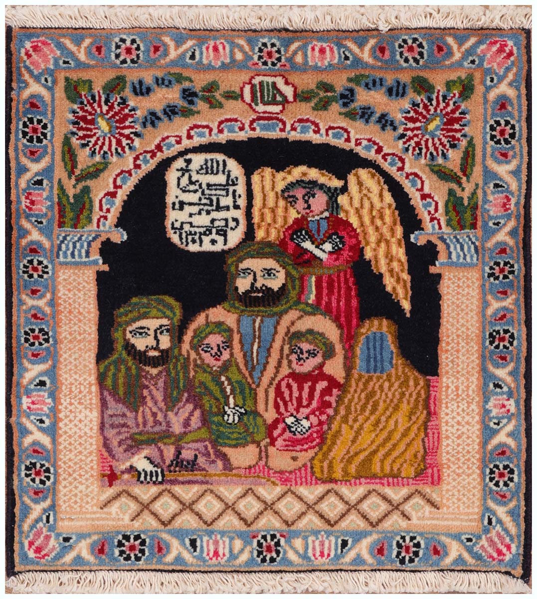 a finely woven Kerman Persian carpet featuring a religious and symbolic scene. At the center, five figures are seated beneath an ornate archway, with an angelic figure standing behind them. The angel is depicted with golden wings and a red robe, holding a staff or scepter, and is positioned protectively over the group. Above the figures, there is an inscription in Arabic script within a circular cartouche, adding a spiritual or scriptural element to the composition.
