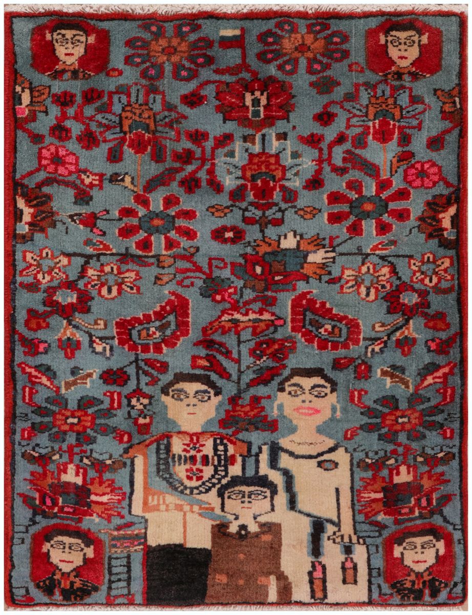 This exquisite Persian rug features a vibrant and intricate handwoven design that beautifully blends traditional motifs with a unique artistic flair which shows the Shah ,his Queen and prince . Dominated by rich reds, deep blues, and soft beige tones, the rug showcases a detailed floral pattern interspersed with stylized human figures, creating a captivating narrative scene. The central composition highlights three prominent figures surrounded by lush, symmetrical floral arrangements, while smaller faces appear in the corners, adding depth and character to the piece. Crafted with meticulous attention to detail, this rug exemplifies the timeless craftsmanship of Persian weaving traditions. Perfect for adding a touch of cultural elegance and warmth to any living space, this rug is a stunning example of authentic Persian artistry and makes a valuable addition to any collection.