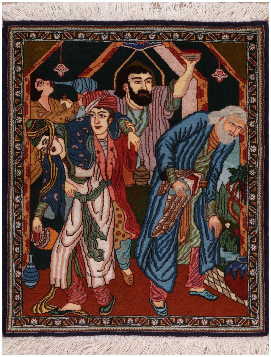 This magnificent Tabriz pictorial rug showcases the exceptional craftsmanship that has made Persian rugs world-renowned for centuries. Meticulously handwoven with premium wool, this 70 x 58 cm treasure features a vibrant narrative scene depicting a gathering of figures in traditional Persian attire, rendered in a rich palette of deep reds, blues, greens, and warm earth tones.