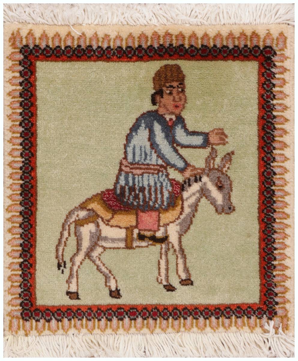 the rug shows a man riding a donkey .Tabriz, a historic city in northwestern Iran, is renowned for its rich cultural heritage and skilled craftsmanship, particularly in rug weaving. Tabriz rugs are celebrated for their intricate designs, vibrant colors, and exceptional quality, often featuring floral motifs, medallions, and symmetrical patterns. These rugs are handwoven using high-quality wool or silk, making them both durable and luxurious. Tabriz’s long-standing tradition of rug-making has made it a significant center for Persian carpets, attracting collectors and enthusiasts worldwide.