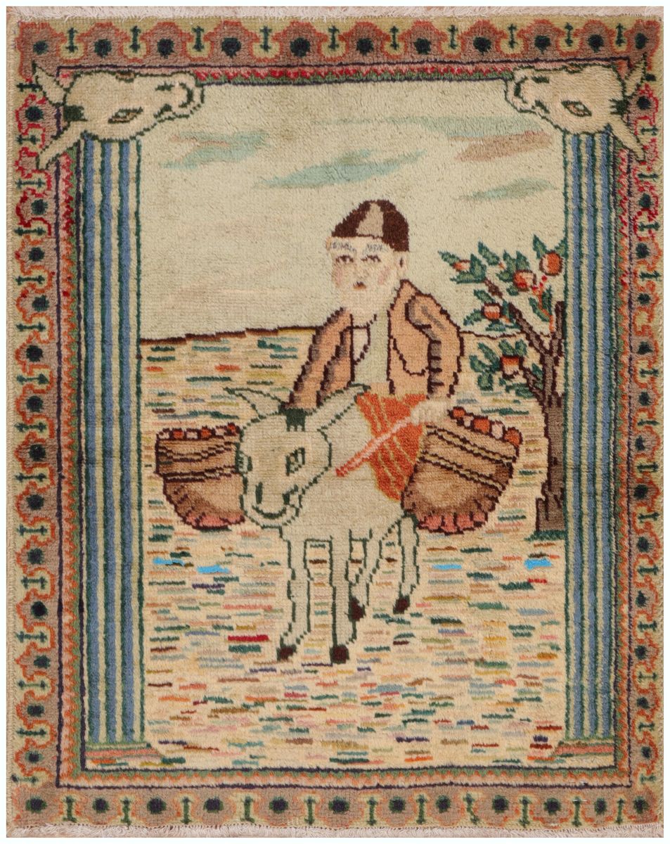 the rug shows an old man riding a donkey .Tabriz, a historic city in northwestern Iran, is renowned for its rich cultural heritage and skilled craftsmanship, particularly in rug weaving. Tabriz rugs are celebrated for their intricate designs, vibrant colors, and exceptional quality, often featuring floral motifs, medallions, and symmetrical patterns. These rugs are handwoven using high-quality wool or silk, making them both durable and luxurious. Tabriz’s long-standing tradition of rug-making has made it a significant center for Persian carpets, attracting collectors and enthusiasts worldwide.
