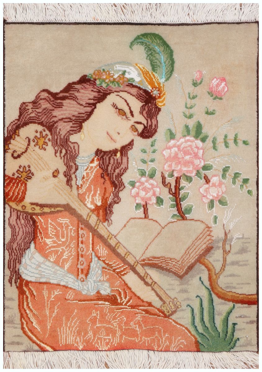 This exquisite Persian Tabriz rug features a stunning pictorial design that beautifully captures the elegance and artistry of traditional Persian weaving. The central motif depicts a graceful figure in a flowing, ornately patterned dress, seated with a classic Persian settar instrument, evoking themes of poetry, music, and cultural heritage. Surrounding the figure are delicate pink roses and lush green foliage, while an open book rests nearby, symbolizing knowledge and artistic inspiration. The soft, harmonious color palette includes warm peach, soft beige, gentle greens, and blush pinks, creating a serene and inviting atmosphere. Finely hand-knotted with exceptional attention to detail, this Tabriz rug is a true work of art, perfect for collectors and those seeking to add a touch of Persian elegance and sophistication to their home décor.