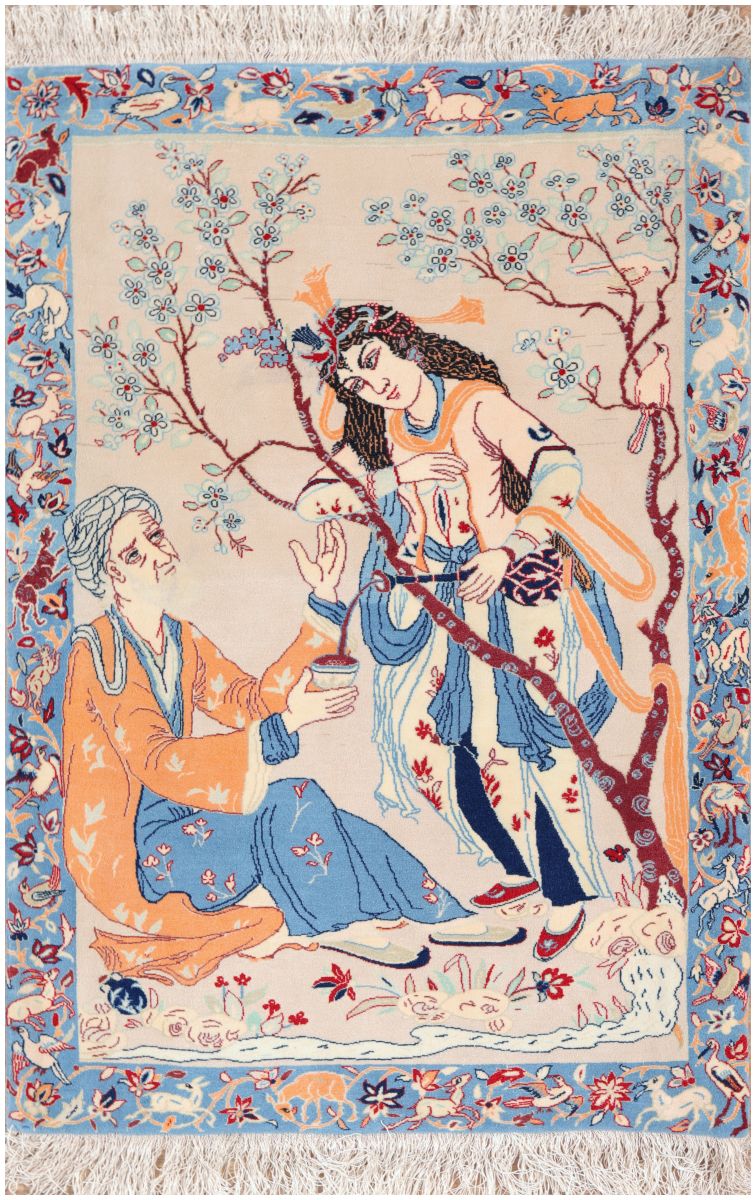 this pictorial isfahan rug shows a young lady pouring wine for an old man. Isfahan, one of Iran’s most historic and culturally rich cities, is renowned for its exquisite carpets and vibrant artistic heritage. Isfahan carpets are considered some of the finest in the world, celebrated for their intricate designs, exceptional craftsmanship, and use of high-quality materials. These handwoven masterpieces often feature traditional Persian motifs such as floral patterns, arabesques, medallions, and symmetrical designs, reflecting the city’s deep connection to Persian art and culture.