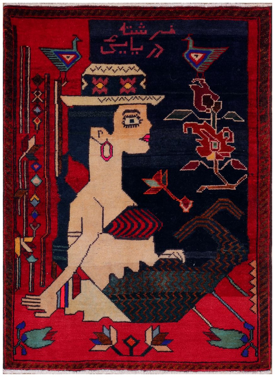 This carpet is a striking example of a pictorial Persian rug, likely from the lorestan region. The design features a stylized, abstract female figure in a reclining pose, rendered with bold geometric lines and strong color contrasts. The background is divided into deep red and navy blue sections, creating a dramatic visual effect. Decorative elements include two colorful, geometric birds perched on either side of the upper section, as well as floral motifs and patterned columns along the sides. There is also Persian script woven into the upper part of the rug, adding a narrative or poetic element. The overall composition showcases both traditional and modern influences, blending classic Persian motifs with a more contemporary, abstract artistic style.