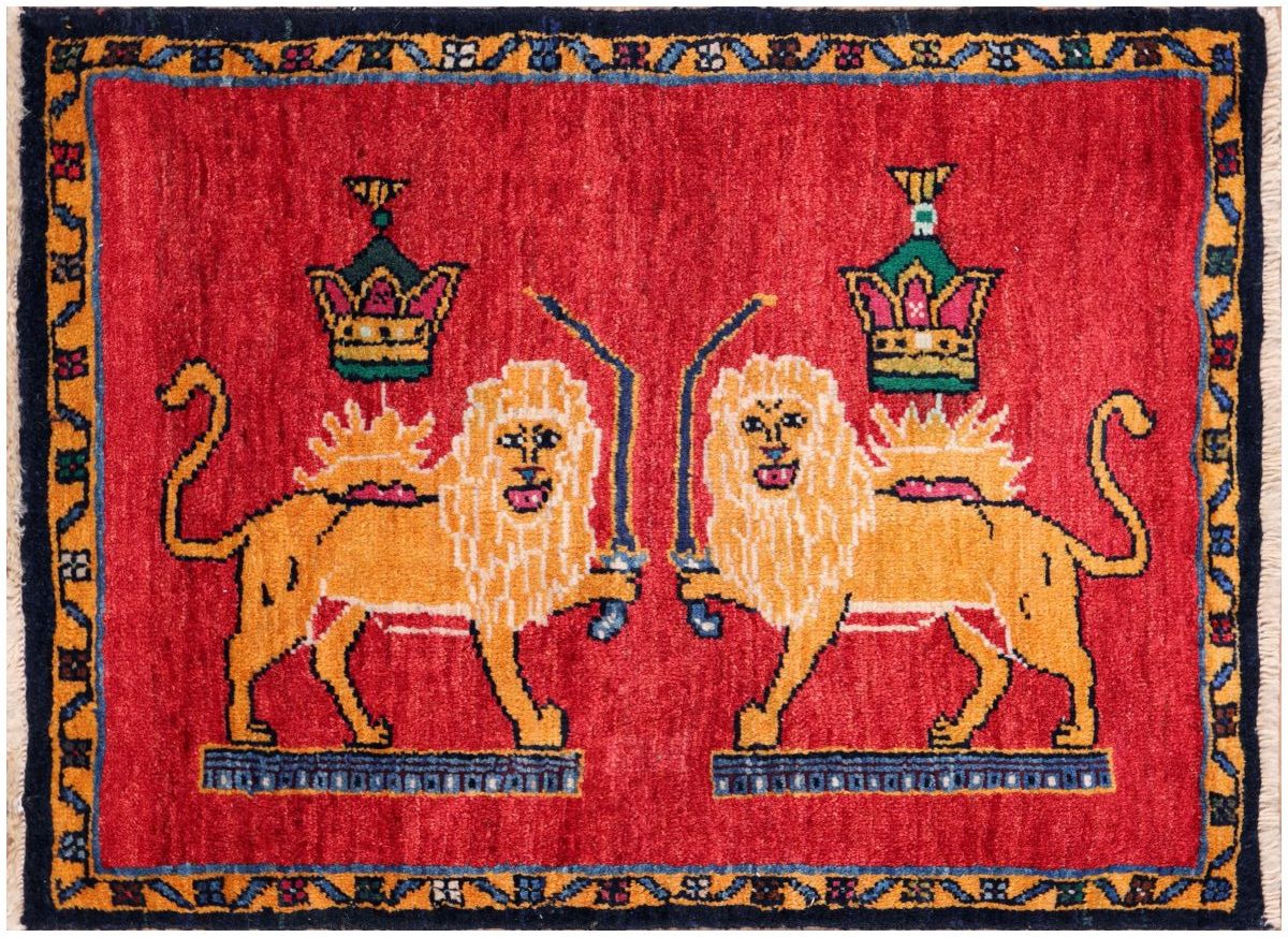 This is a vibrant Shiraz pictorial Persian carpet featuring two golden lions standing side by side on a rich red background. Each lion faces forward, with detailed manes and expressive faces, and both hold a sword upright in their front paws. Above each lion is a large, ornate crown with green, gold, and red accents, symbolizing royalty. A radiant sun motif appears behind each lion, adding a sense of power and majesty. The border is decorated with a yellow and blue geometric pattern, framing the central scene. The overall style is bold and graphic, with strong outlines and traditional symbolism.