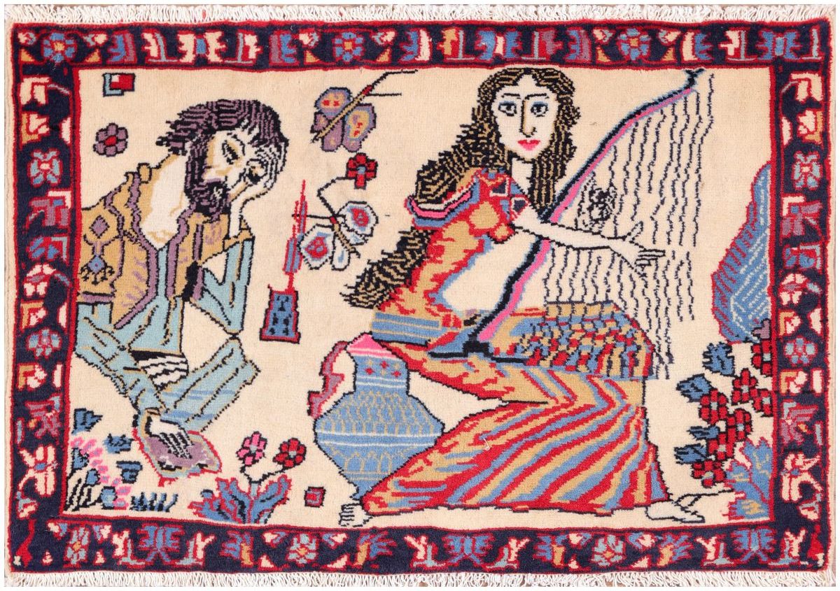 Hamedan pictorial, handwoven Persian carpet featuring an artistic scene with a couple. On the left, a man with a contemplative expression is seated, dressed in traditional attire with a robe in soft blue and yellow hues. He holds a book, poetic theme. To the right, a woman in a vibrant, multicolored dress is seated and playing harp, her long, wavy hair cascading down her back. The overall style blends traditional Persian artistry with expressive, almost modernist elements, creating a visually striking and culturally evocative textile.