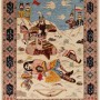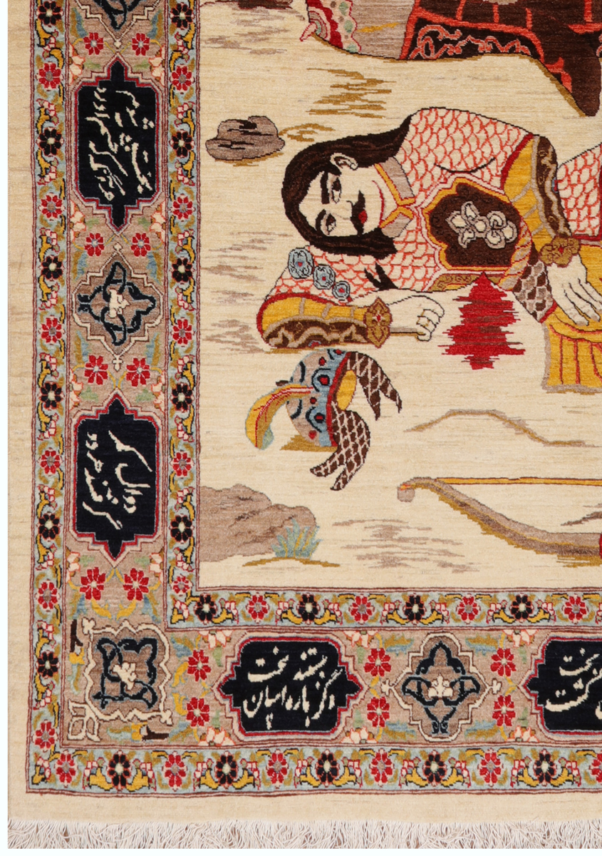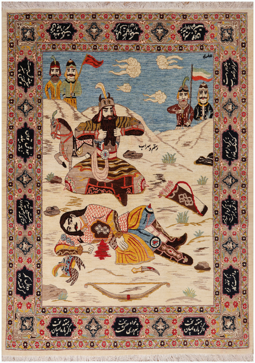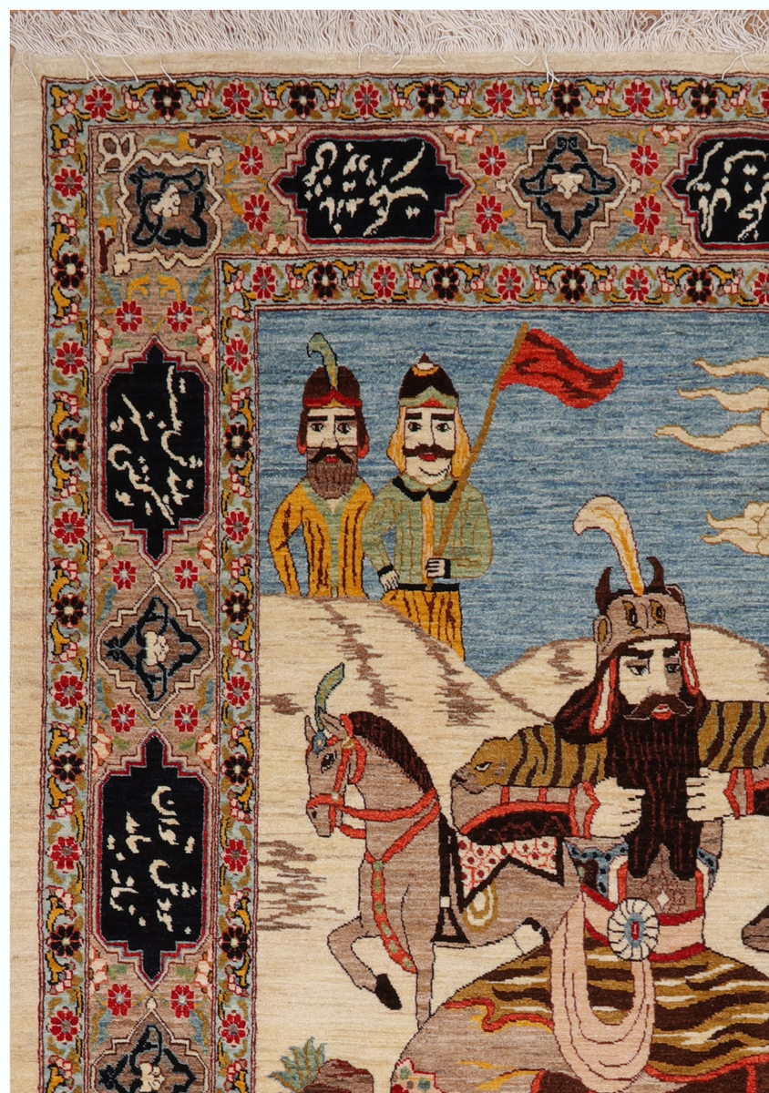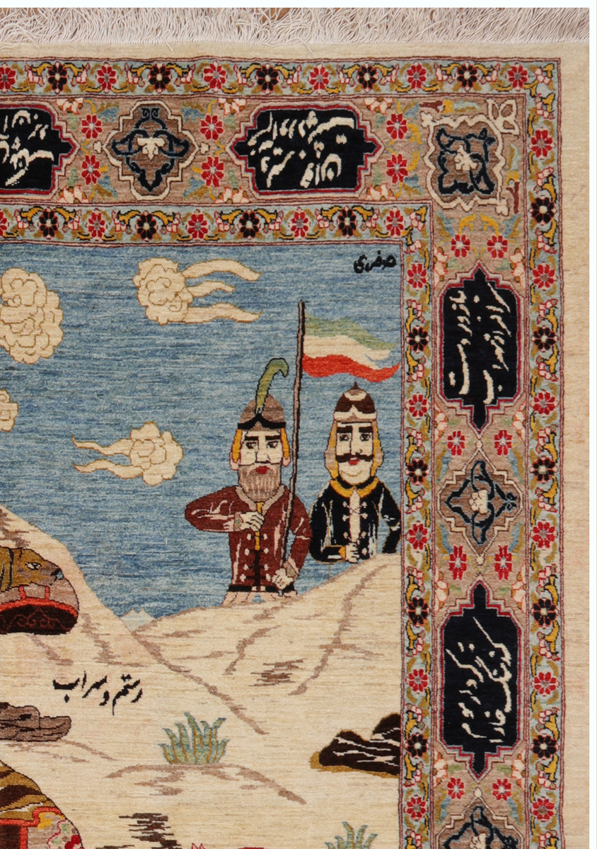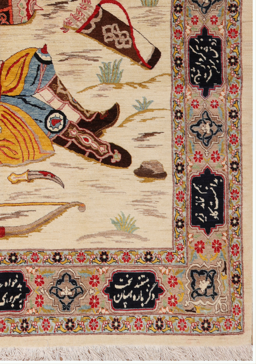 The legendary battle between Rostam and Sohrab, one of the most moving and tragic episodes of Ferdowsi’s *Shahnameh*, has inspired countless works of Persian art, including intricately woven carpets that capture the emotional intensity and heroic grandeur of the story. In these masterpieces, the figures of Rostam and Sohrab are often shown in the midst of a duel – engaged in a fierce but fateful battle, their expressions a mixture of courage, confusion and sorrow. The intricate borders and motifs surrounding the central scene reflect the grandeur of ancient Persian design, while the colors – deep reds, royal blues and rich golds – emphasize the gravity of the moment. Such a carpet is not only a decorative piece, but a storytelling canvas that preserves a deep cultural heritage, reminding viewers of the power of fate and the heartbreaking cost of pride and war.