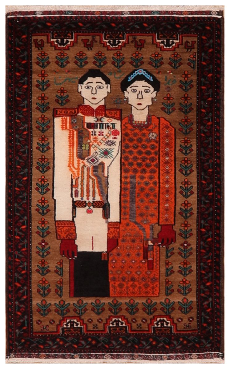 this Balouch carpet shows Iranian Shah and Queen, also known as Baluchi rugs, are traditional handwoven textiles crafted by the Balouch tribes, primarily located in regions of Iran, Afghanistan, and Pakistan. These carpets are renowned for their intricate designs, rich cultural heritage, and exceptional craftsmanship. Typically made from high-quality wool, Balouch carpets are characterized by their deep, earthy tones such as red, brown, blue, and black, often accented with ivory or white.