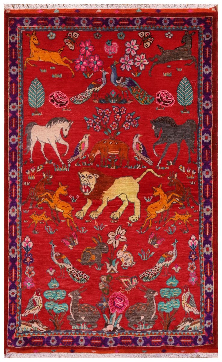 This vibrant Persian rug features a lively pictorial design set against a rich red background. The central field is filled with a delightful menagerie of animals and birds, each rendered in a bold, folk-art style. At the center, a large, majestic lion stands out, surrounded by prancing horses, deer, rabbits, and a variety of birds, including colorful peacocks and pheasants.